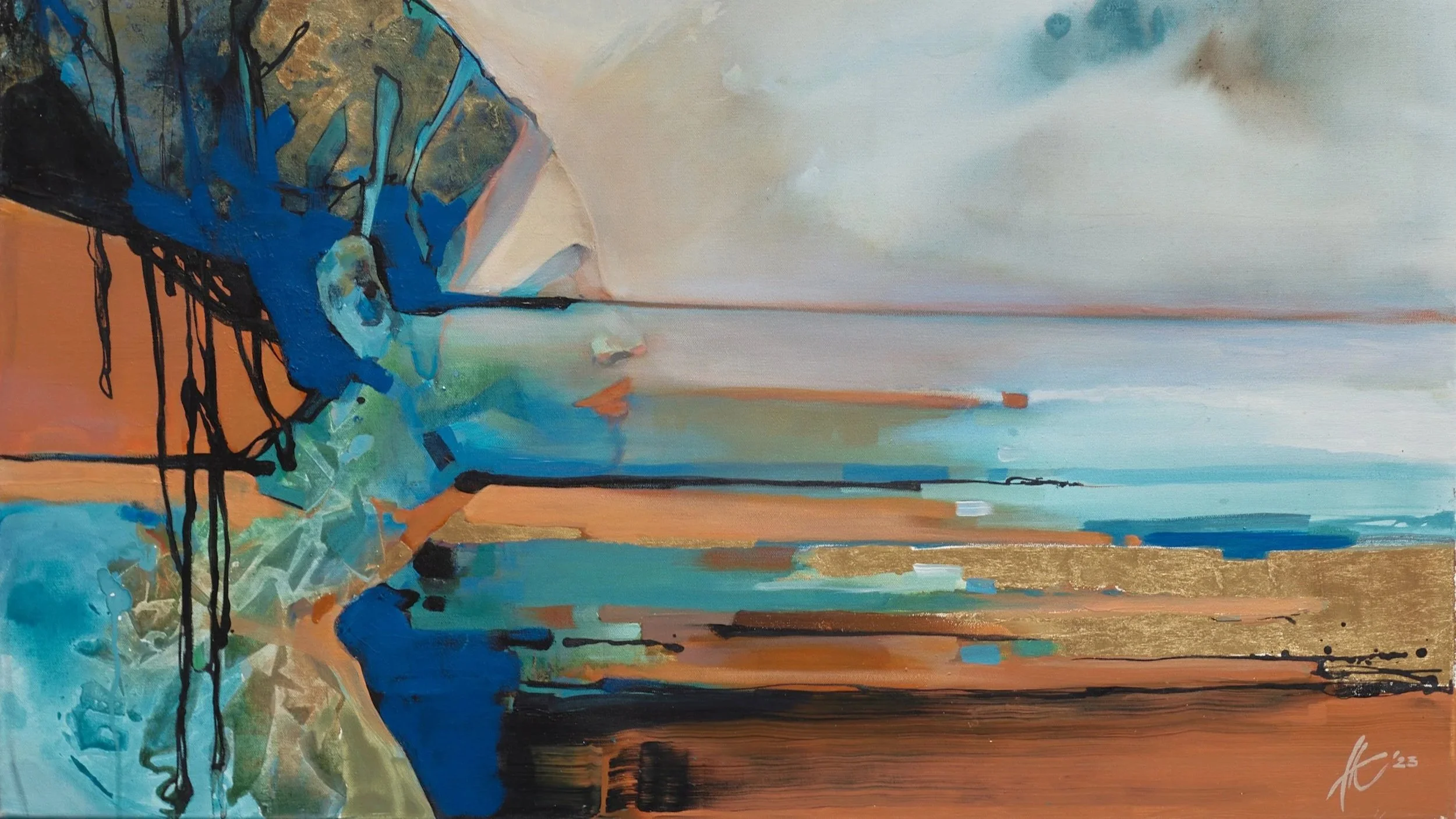 "Mirrage" 2024. The fragile moment when we release old beliefs and emerge changed after an inner transformation. The figure merges with the landscape like a memory fading in the light. Lines soften, colors shift, and it becomes difficult to discern where features end and the horizon begins. Like a mirage - once real, yet ultimately vanished. Size: 100 × 80 cm. Acrylic on canvas.